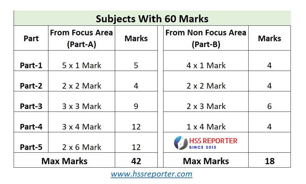 2022ലെ എസ്എസ്എൽസി,പ്ലസ് ടു പൊതു പരീക്ഷകളുടെ ചോദ്യപേപ്പറിൽ ഒരേ മാർക്കുള്ള ചോദ്യങ്ങളുടെ സെക്ഷനുകളിൽ ഫോക്കസ് ഏരിയയിൽ നിന്നുള്ള ചോദ്യങ്ങളെ (Part A) യിലും നോൺ ഫോക്കസ് ഏരിയയിൽ നിന്നുള്ള ചോദ്യങ്ങളെ(Part B) യിലും ഉൾപ്പെടുത്തിയാണ് ക്രമീകരിച്ചിരിക്കുന്നത്